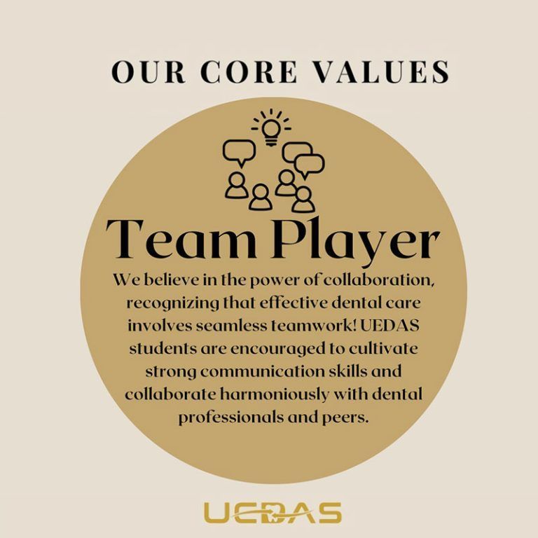 At the center of United Exchange Dental Assisting School are our core values — Service, Team Player and Innovation.